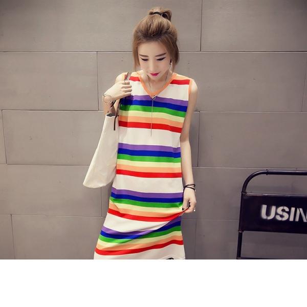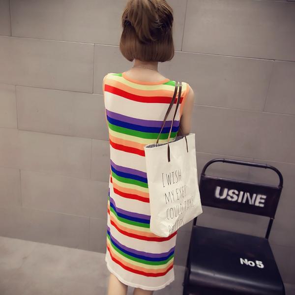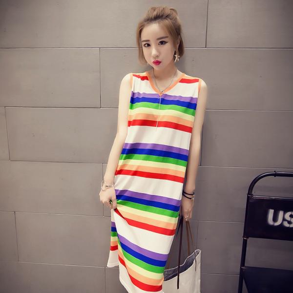 レインボーストライプの明るいカラーリングのロングワンピース。