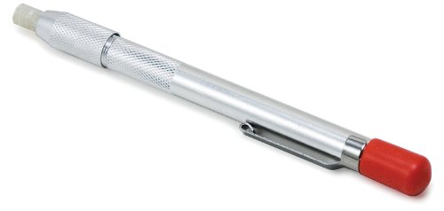 -. Feature : Pen type holder includes collet-style clamp with pocket clip and built-in sharpener / Includes one round soapstone marker / White lines are visible through shaded welding lens