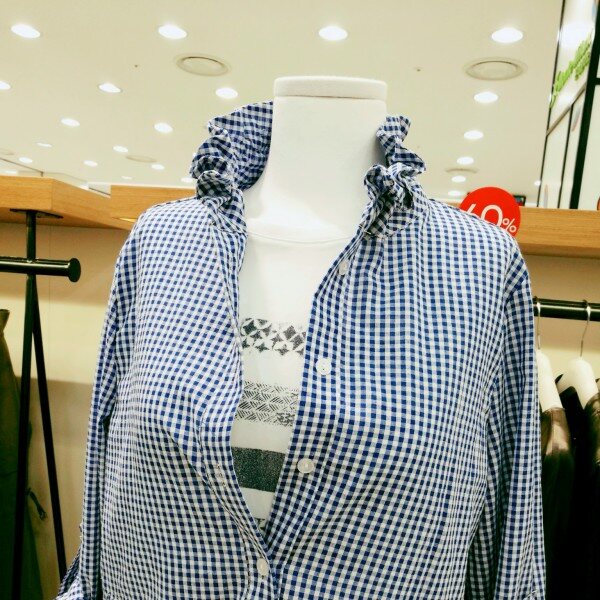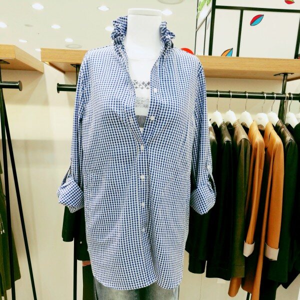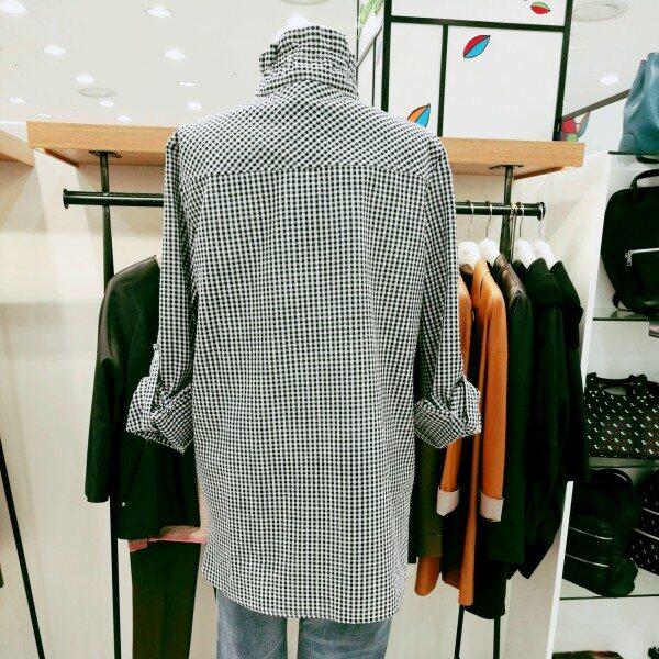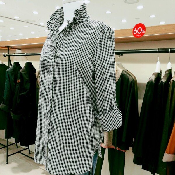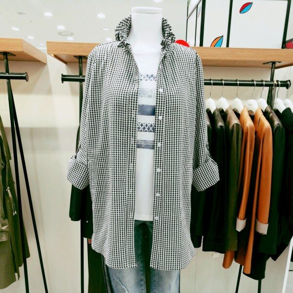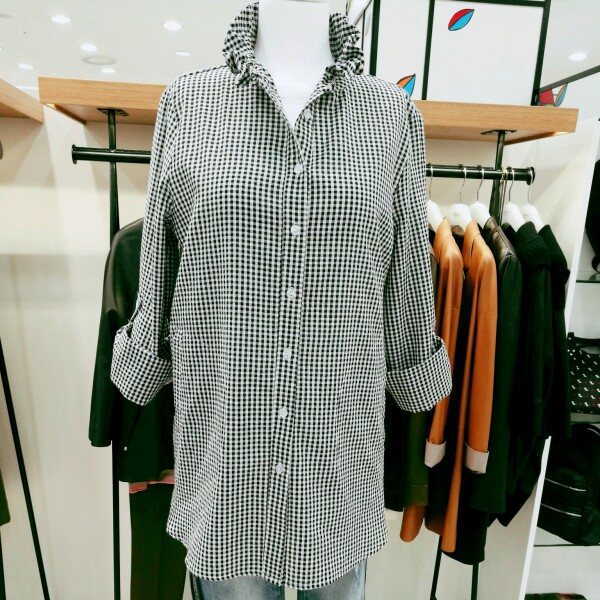 잔잔한 체크블라우스입니다목선에 와이어가있어 연출이 자유로우며 폴리에스테르 소재로 물세탁이 가능합니다