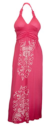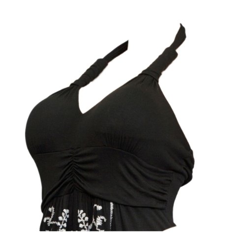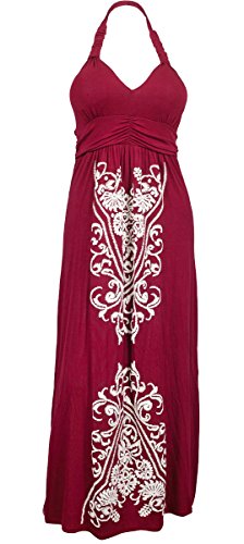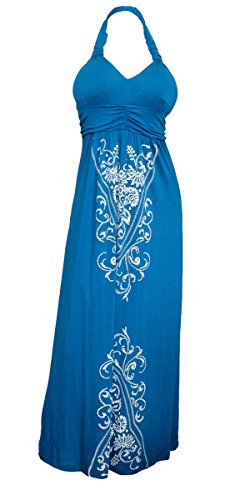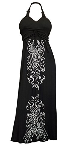 Available in Junior plus size 1XL, 2XL, 3XL. Plus size maxi dress features halter neck design. Delicate embroidery print adorns this breezy plus size dress. Ruched bodice. Skirt falls to the calf. Perfect wear everyday or night out on the town dress. Rayon blend fabric.Feature