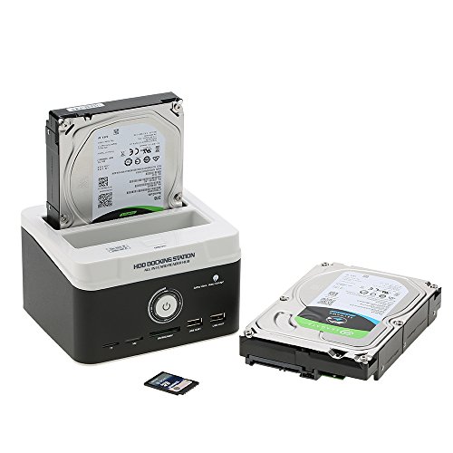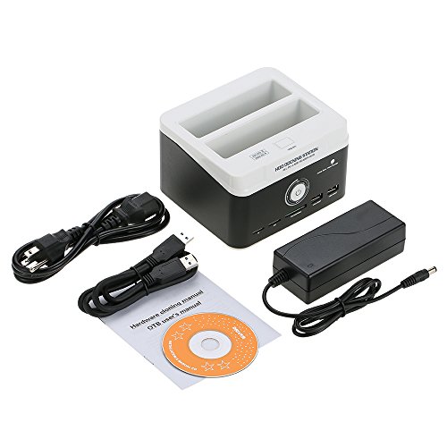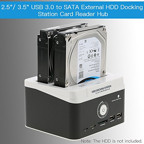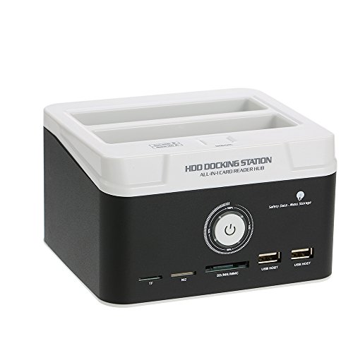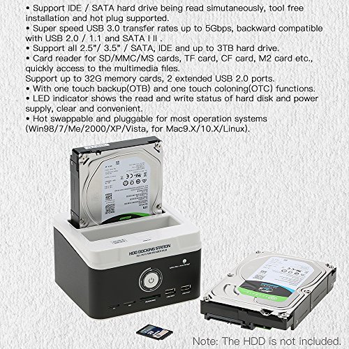 Studio : KKmoon Publisher : KKmoon Binding : Electronics Product Description Specification: Material: ABS Metal Color: White Black Interface: 1 * USB 3.0, 2 * USB 2.0 Host, 1 * TF, 1 * M2, 1 * SD/ MS/ MMC Fits HDD size: 2.5inch/ 3.5inch SATA HDD capacity: Up to 3TB Hot plug: Support Input voltage: 100V-240V 50/60Hz 1.5A Output voltage: DC 12V 3000mA Output interface: 480Mbps(USB2.0); 5Gbps(USB3.0) Integrated card reader: for SD/Mini SD/Micro SD card, TF card, CF card, M2 card and MMC/MS cards. Operating system: for Win98/7/Me/2000/XP/Vista, for Mac9.X/10.X/Linux Item weight: Approx. 737g/ 1.6lb Plug: EU,US,AU,UK(optional)