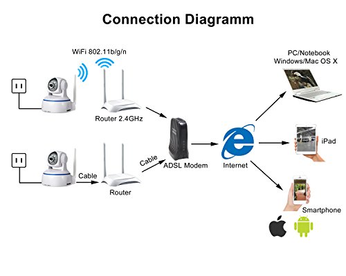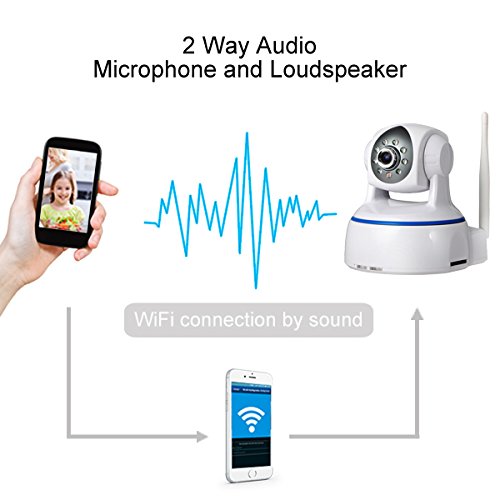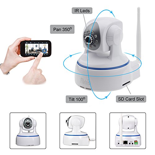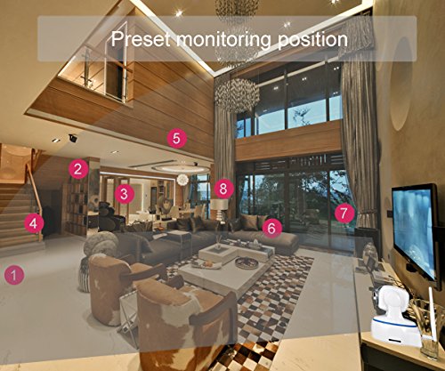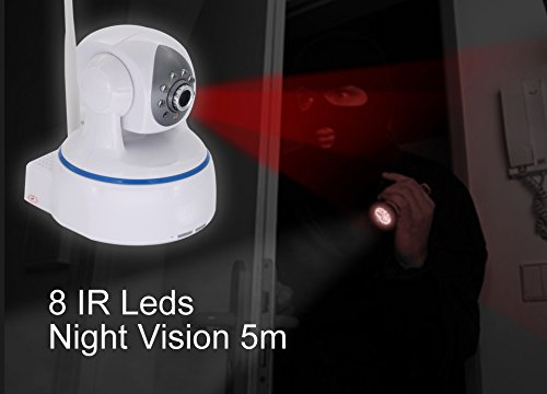 -. Feature : Good live picture with Full HD 1080p. Thanks to the free smartphone app, you can monitor the room at any time. In the dark, it automatically switches to night mode. 8 IR Leds, night vision up to 5m / Easy Installation. Wireless connection by WiFi 802.11b/g/n. Remote controlled rotatable 350° and tiltable 100°, digital zoom function / 2 way audio, integrated microphone and speakers, so you can also talk and listen to via mobile phone (Android / IOS). Especially suitable for baby monitoring or other who need care / 24 hours of video recording and motion detection provide the best security. Alarm by App Message and to email, FTP Server or store in micro sd card / Multi-level user administration and password allocation. P.R.Ivacy, in viewing mode 1 Definition of areas that should not be monitored by the camera