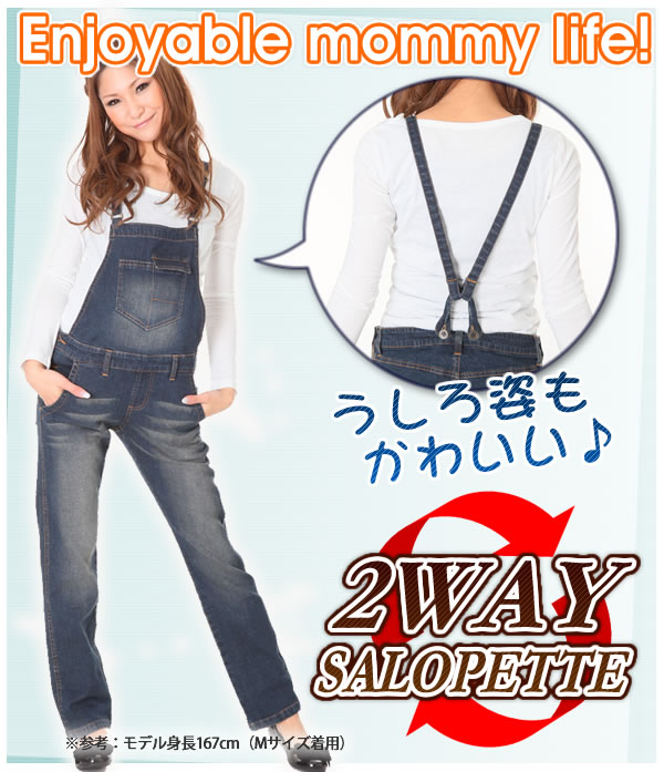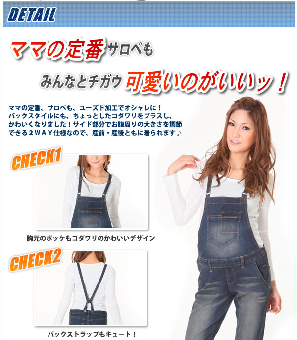 ママの定番サロペも、ユーズド加工でオシャレに!バックスタイルにも、ちょっとしたコダワリをプラスし、かわいくなりました!サイド部分でお腹周りの大きさを調節できる2WAY仕様なので、産前・産後ともに着られます♪