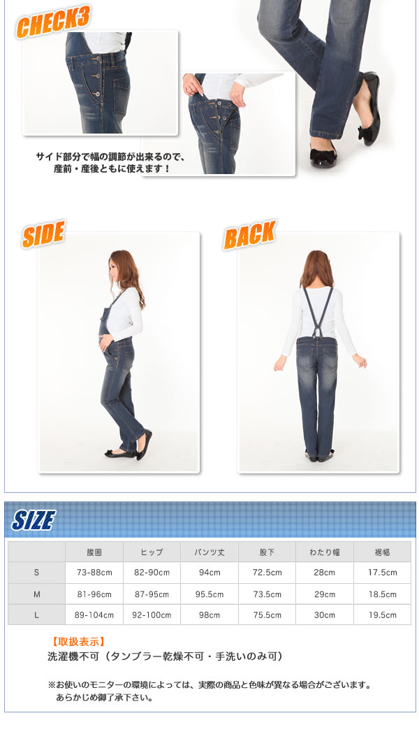 ママの定番サロペも、ユーズド加工でオシャレに!バックスタイルにも、ちょっとしたコダワリをプラスし、かわいくなりました!サイド部分でお腹周りの大きさを調節できる2WAY仕様なので、産前・産後ともに着られます♪サイズ/S、M、L 製造国/中国 ※サプライヤー直送品 ご注文後、当日~1営業日後の出荷となります【商品名】2WAYロングサロペット 295119 ユーズドネイビーL