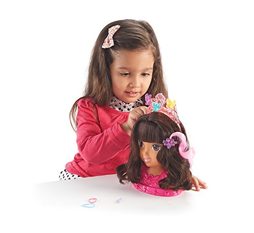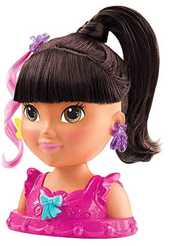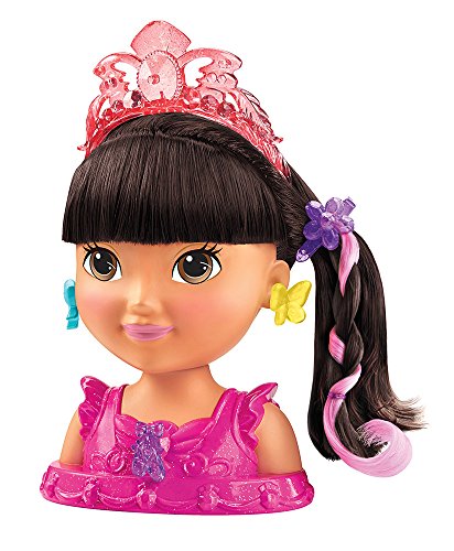 Feature : Endless styles! Dora Styling Head features beautiful, long hair that can be brushed, braided and styled! / Add some flair with a pink hair highlight / Dora comes with a beautiful tiara that can be decorated with the included clip-on charms! / The charms can also be used as earrings for Dora or used to decorate her dress! / Includes Dora styling head, tiara, brush, three hair ties, three charms and a clip-on hair highlight!