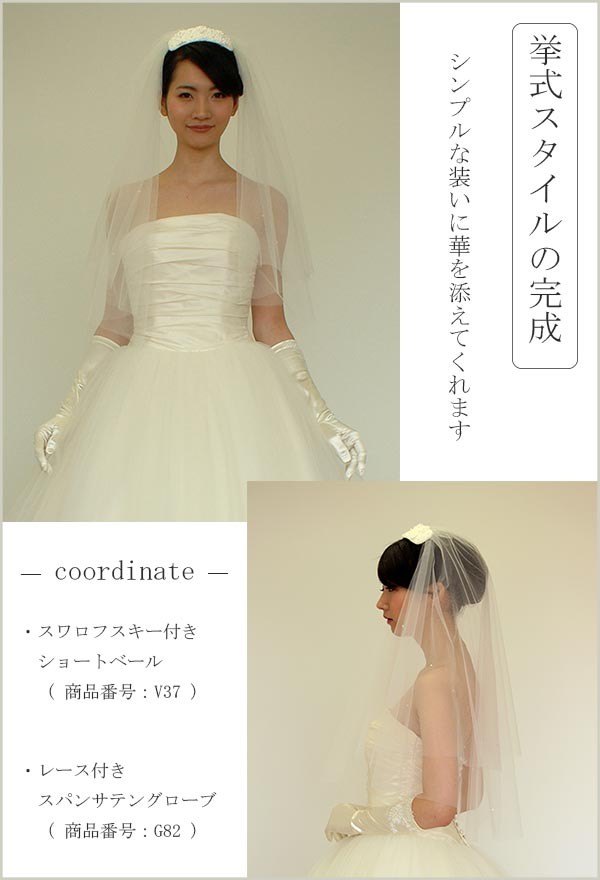 コーディネートのご参考にどうぞ ★モデルが装着しているウェディングベールは、スワロフスキーがあしらわれたショートベール( 商品番号:V37 )になります。 またウェディンググローブは、レース付きスパンサテングローブ( 商品番号:G82 )になります。