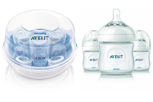 -. Binding : Baby Product -. Brand : Philips AVENT -. EAN : 0700465430649 -. Feature : Holds a variety of bottles, breast pump parts, and accessories; Eliminates 99.9 percent of bacteria in just two minutes* / Easy to use with most microwave ovens; Contents stay sterile up to 24 hours if the lid stays closed / Compact design is well-suited for travel / Comes with 3 4-Ounce Bottles - Wide neck makes filling and cleaning easier; Advanced anti-colic system with innovative twin valve design vents air into the bottle and not baby's tummy; Nipple is breast-shaped to promote natural latch-on / Ergonomic bottle shape makes the bottle easy to hold and grip in any direction for both you and your baby; BPA Free polypropylene material is easy to sterilize -. Label : Philips Avent -. Manufacturer : Philips Avent -. ProductGroup : Baby Product -. ProductTypeName : BABY_PRODUCT -. Publisher : Philips Avent -. Studio : Philips Avent -. Title : Philips AVENT Microwave Steam Sterilizer with 4oz Bottles -. UPC : 700465430649