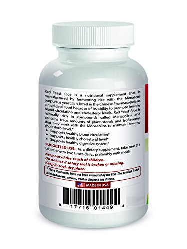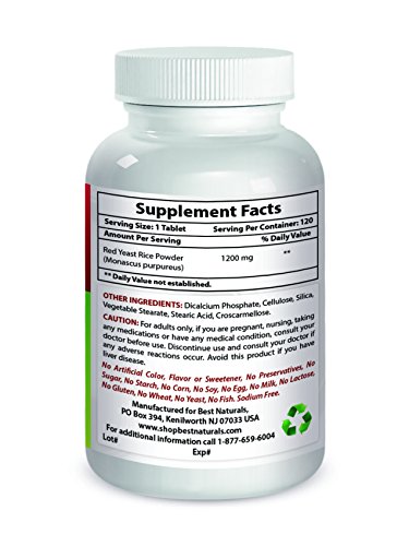 -. Binding : Health and Beauty -. Brand : Best Naturals -. EAN : 0817716014494 -. Feature : Red Yeast Rice is known to promote HMG-CoA reductase inhibition action which may help to promote healthy cholesterol levels / Cardiovascular Support -- High Potency Formula / It is considered beneficial for adult men and women when taken as part of a lifestyle program that includes regular exercise and a healthy diet / Carefully fermented to avoid byproduct citrinin / All Best Naturals products are manufactured in accordance with Good Manufacturing Practices (GMP), among the highest standards in the world -- Proudly Made in USA -- Purity & Potency Guaranteed -. IsAdultProduct : 0 -. Label : Best Naturals -. Manufacturer : Best Naturals -. MPN : 817716014494 -. PackageQuantity : 1 -. PartNumber : 817716014494 -. ProductGroup : Health and Beauty -. ProductTypeName : HEALTH_PERSONAL_CARE -. Publisher : Best Naturals -. Studio : Best Naturals -. Title : Best Naturals Red Yeast Rice 1200 mg 120 Tablets -. UPC : 817716014494