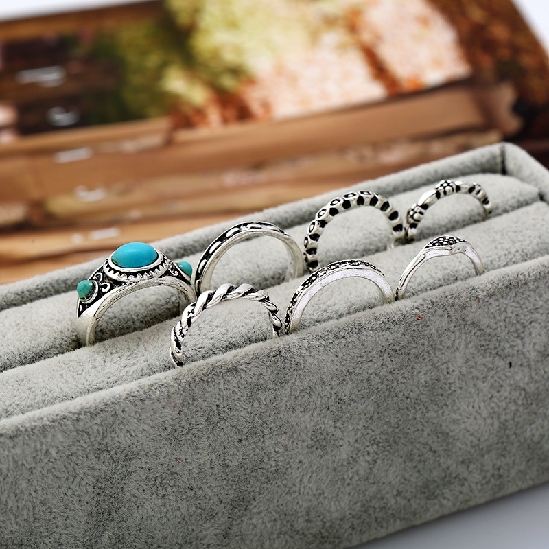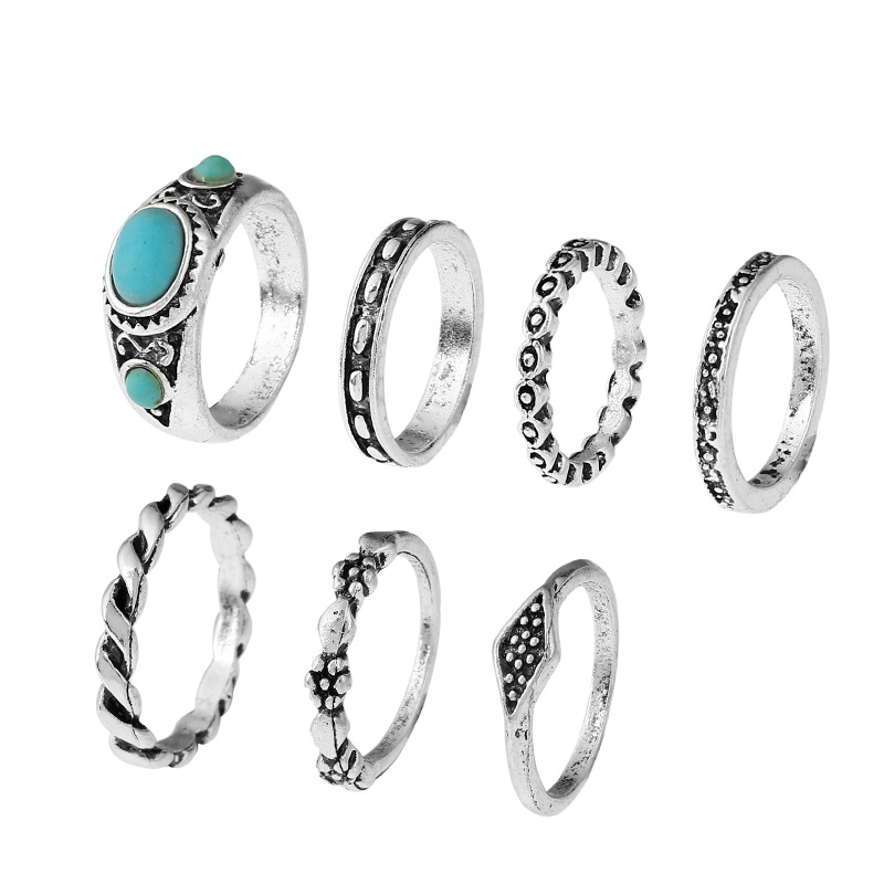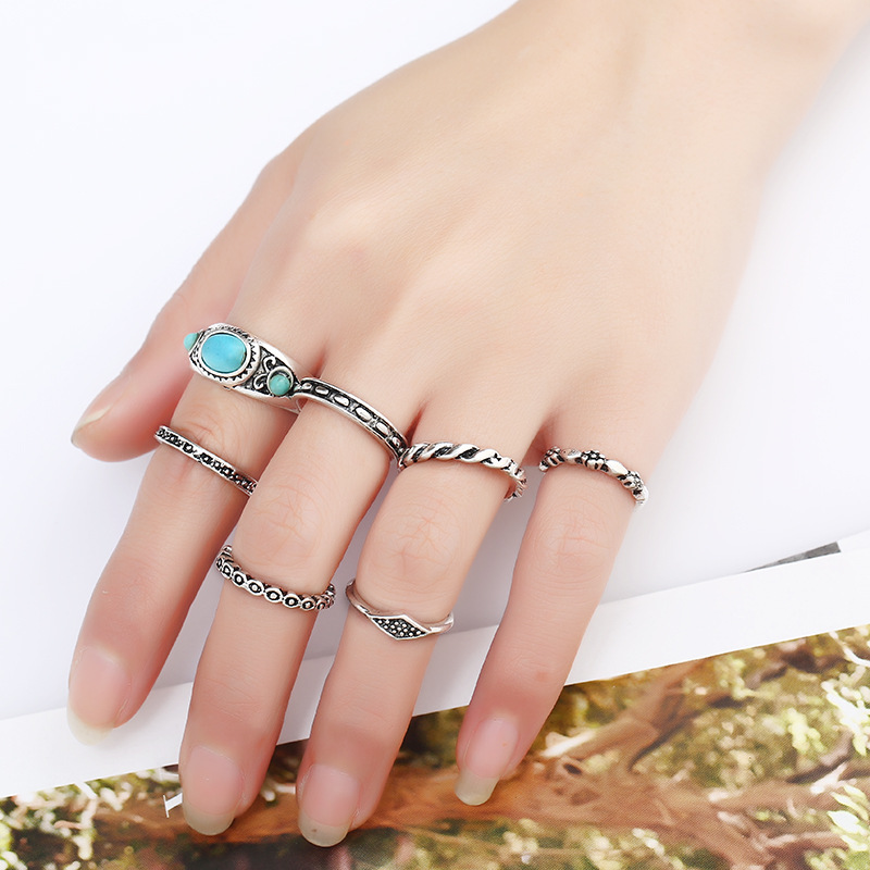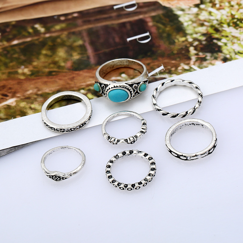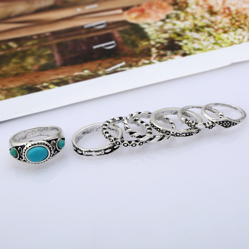 产品名称:2017新款套装戒指 欧美热销时尚民族风复古雕花松石7件套关节戒指 复古戒指