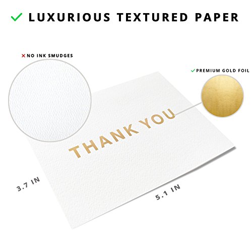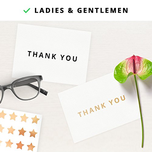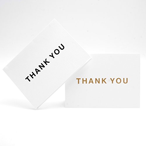 SIMPLE MODERN This set of 30 luxury thank you cards embodies a gorgeous minimalistic design where simplicity is often the most beautiful. Includes 15 cards with "Thank You" embossed in shiny gold foil and 15 cards in classy vintage black - the perfect variety for all your guests