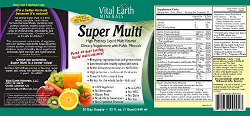 -. Binding : Health and Beauty -. Brand : Vital Earth Minerals -. EAN : 0855748000023 -. Feature : More energy, better mental concentration, clarity, memory, and moods / Assists weight control, lessens unhealthy cravings, balances fluctuations in blood sugar / Stimulates healthy cell development, tissue repair and growth / Supports healthy immune system function during times of season challenge / Promotes a healthy nervous system and improved circulation -. IsAdultProduct : 0 -. Label : Vital Earth Minerals -. LegalDisclaimer : These statements have not been evaluated by the Food & Drug Administration. This products is not intended to diagnose, cure, mitigate, treat, or prevent any disease. -. Manufacturer : Vital Earth Minerals -. Model : 00002 -. MPN : SM -. NumberOfItems : 1 -. PackageQuantity : 1 -. PartNumber : SM -. ProductGroup : Health and Beauty -. ProductTypeName : HEALTH_PERSONAL_CARE -. PublicationDate : 2014-09-26 -. Publisher : Vital Earth Minerals -. ReleaseDate : 2014-09-23 -. Size : 32 OZ -. Studio : Vital Earth Minerals -. Title : Vital Earth Minerals Super Multi Liquid Vitamins, 32 Fluid Ounce -. UPC : 855748000023