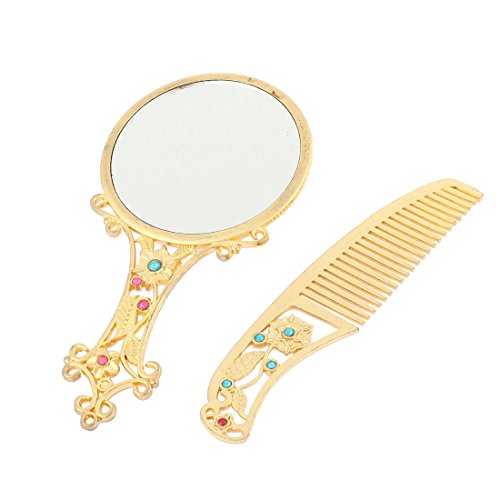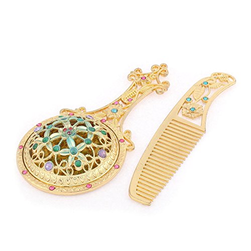 uxcell Flower Shaped Handheld Beauty Makeup Compact Mirror Comb Set Gold Tone
