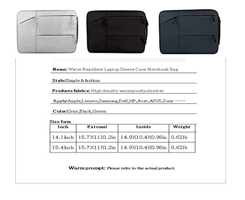 Studio : EW Publisher : EW Binding : Personal Computers Product Description Compatibility Designed Specifically for Apple Macbook Pro 14-15.4inch Macbook Air 14-15.4 inch and Lenovo,Samsung,Dell,HP,Acer,ASUS,Sony ......and more, Laptop absolutely attract people attention. -Easy to Access Carry Quick top-loading zippered designed, your device can be slid into your backpack or other bag easily. Attached handle allows for sleeve case to be carried wherever you go. - Multi-pocket Storage A main compartment for a laptop and IPad, 3 front pockets with zippered access for phone, cards, chargers, mouse and more. - Superior Protection High quality of water-resistant oxford cloth exterior, pearl wool and soft interior material will protect your device against accidental spills, bumps and scratches; exquisite craft processing sewn can help prevent the laptop carrying sleeve from bursting. - Stylish and Decent in Appearance Minimalistic in design can ensure the protective sleeve is stylish and decent in appearance while you are on the go, a great choice for business, traveling and office. Specification: Internal Dimensions: 14.9 x 10.4 x 0.98 in Compatibility all 14-15.4inches laptop computers Weight:0.62lb Package Include:1x EW Laptop Carrying Sleeve 0