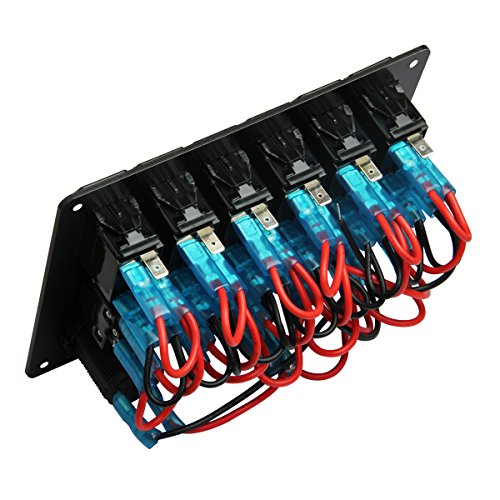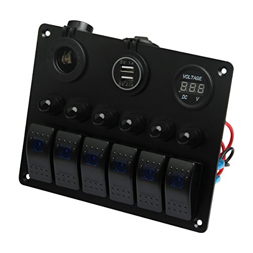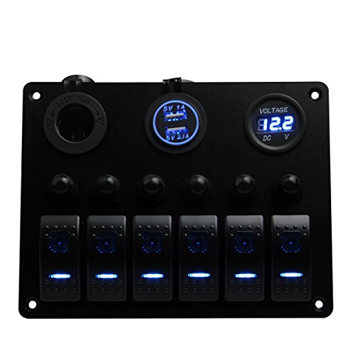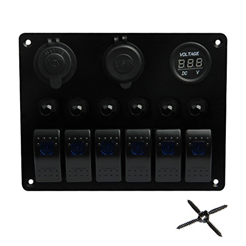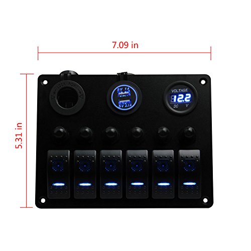 Boat Car Marine Switch Panel 6 Guang, TEQStone LED Rocker Blank Switch Panel with Circuit Breakers&Digital Voltmeter+12V Cigarette Socket & USB Power Charger Adapter(Green,Blue,White,Red)