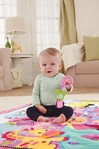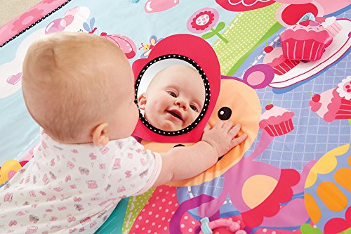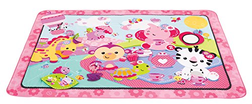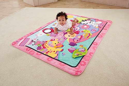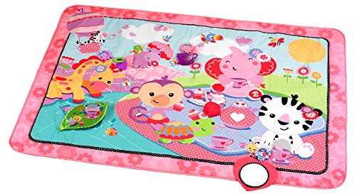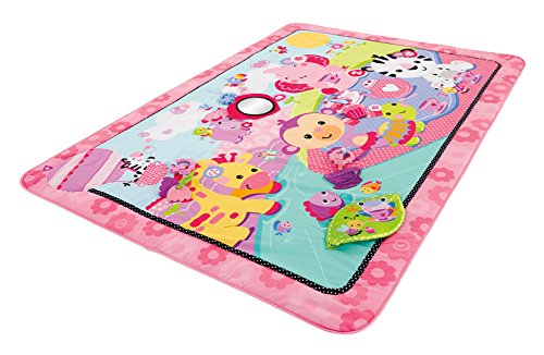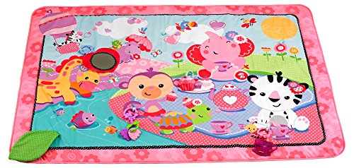 - Feature : Extra-large play space (almost 5' long) / Encourages baby to roll, push up and explore / Great for lay and play or tummy time / A pink tea party scene with pretty colors and patterns / Five interactive toys and activities include a heart mirror, plush cupcake with jingle, flower clacker, teacup teether and crinkly, peek-a-boo leaf