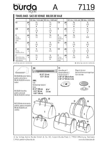 -. Binding : Office Product -. Brand : Burda -. Feature : BURDA 7119 SEWING PATTERN / TRAVEL BAGS / 3 STYLES IN SMALL AND LARGE / INSTRUCTIONS ENGLISH, FRENCH, SPANISH -. Label : BURDA -. Manufacturer : BURDA -. Model : 7119 -. PackageQuantity : 1 -. ProductGroup : Art and Craft Supply -. ProductTypeName : ART_SUPPLIES -. Publisher : BURDA -. Studio : BURDA -. Title : BURDA 7119 TRAVEL BAGS 3 STYLES IN SMALL & LARGE ~ SEWING PATTERN