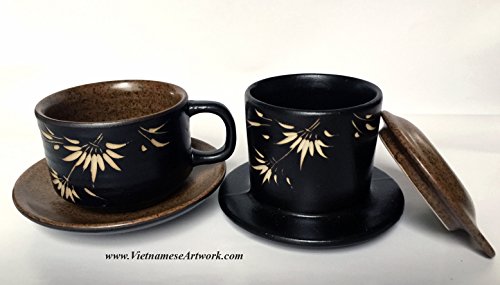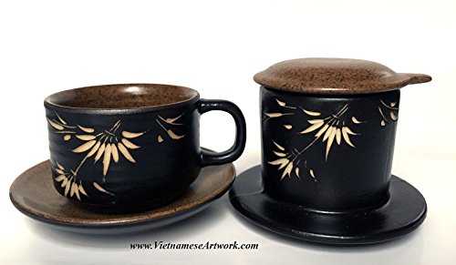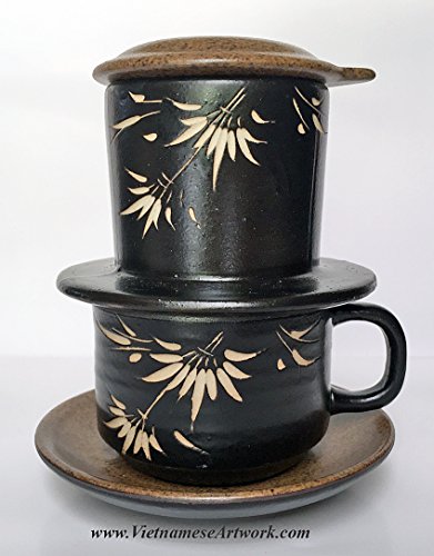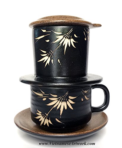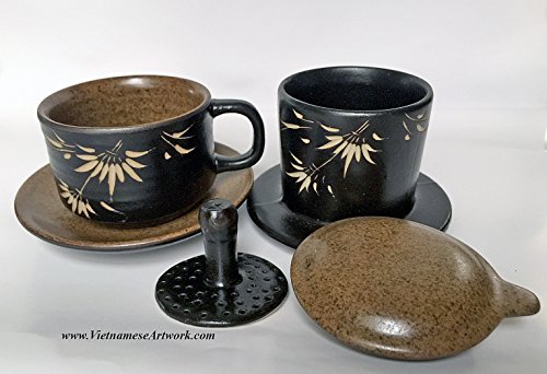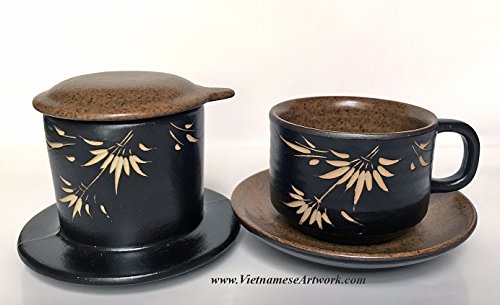 Studio : Asia2you Publisher : Asia2you Product Description Have you tried Vietnamese coffee yet? This set will help you to brew your coffee in Vietnamese style at home. Beautiful hand made ceramic coffee set. A set contains a coffee filter and a matching coffee cup. Design and made especially for Vietnamese coffee. This five pieces set has two parts: the coffee filter (filter, pressure cap and a lid) and a coffee cup and a brown saucer. It's beautiful, elegant, and especially makes delicious coffee in Vietnamese style. It's very easy to use and clean. The ceramic will maintain the heat of the water during the brewing process. 1. Add one - two table spoon of ground coffee. You can use any kind of coffee. Then, put the pressure cap on top of the coffee. 2. Put the filter on top of the coffee cup 3. Pour in hot water. We recommend boiling water. Close the top of the filter with the brown lid. 4. Coffee will be dripped down to the cup until the filter is empty. Enjoy the coffee. The coffee made this way is very thick and strong. You can use any kind of coffee. Vietnamese people like to add condensed milk to the coffee! Size: 5" high A set contains five pieces: Saucer: 4.5" Cup: 2" high x 2.7" diameter Filter: 2.5" x 3.5" diameter Brown Lid: 3.5" diameter Black Pressure lid Color: coffee brown and black ceramic with white bamboo. 0