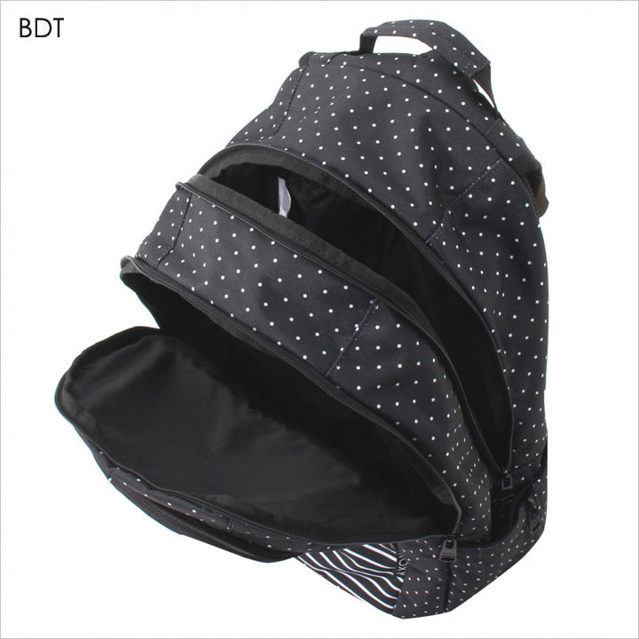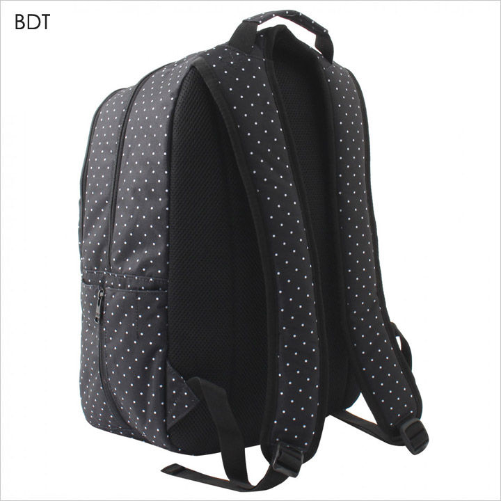 奥行きのあるフォルムで大きく2つに分かれたコンパートメント仕様に加え、使いやすいアウトポケットもついたバックパックです。全体に角を丸くした曲線を生かし、女性らしい雰囲気に仕上がっています。大きく目立つように配したロゴでブランド力もしっかりアピール。柄、無地ともにワンカラーでまとめ、クセもなくデイリーユースに最適なオススメアイテムです。