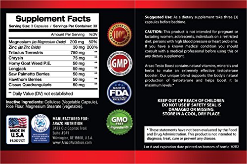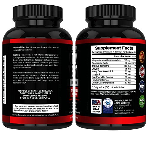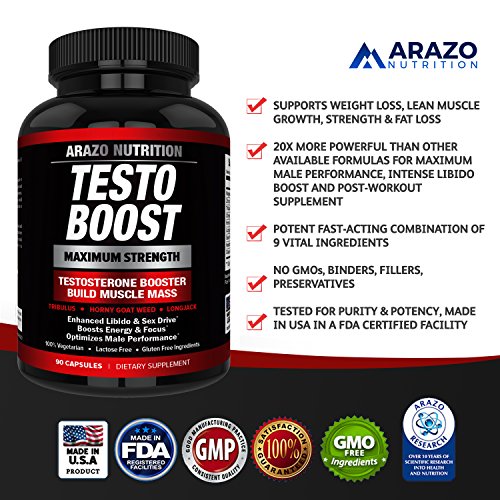 Arazo Nutrition TESTOBOOST Test Booster Supplement - Potent & Natural 90 Herbal Pills - 30 Day Supply - with Tribulus, Horny Goat Weed, Hawthorn, Zinc, Longjack, Saw Palmetto, Magnesium Oxide