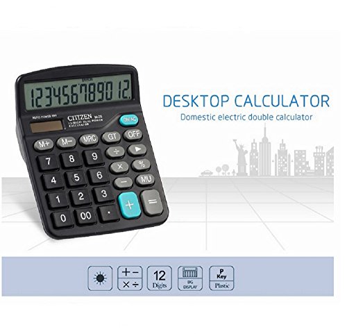-. Feature : Large display, simple and neat buttons, symmetrical ergonomic design so that numbers can be grasped easily. / Multi - function 12 - bit solar calculator,perfect for office, school, engineering, finance etc. / Two-way power: solar and battery (one AA battery included). / Easy to carry and easy to use, it can help you whiz through tricky math problems , make your work and life more convenient. / Durable plastic keys, hight resilience key design conveninent input.