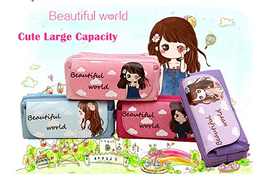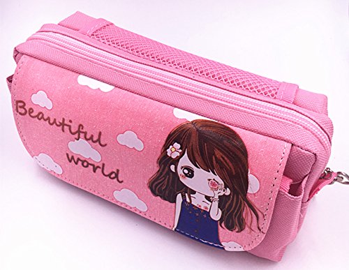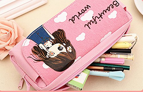 TECH-P Creative Life Portable Large Capacity Cute Pink Multi-layer Cartoon Pencil Case Cosmetic Bag Simple Lovely Cute Canvas Multi-functional Stationery Gift For Girls