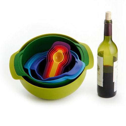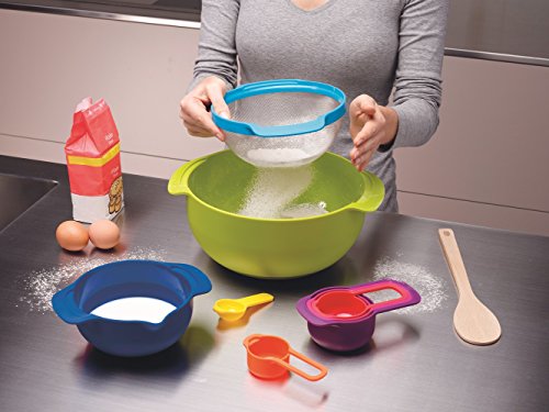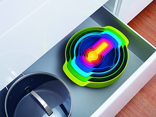 Studio : Joseph Joseph Publisher : Joseph Joseph Binding : Kitchen Product Description Nest Nine Plus is the ultimate collection of practical, space-saving kitchenware comprising a unique range of food preparation sets. The innovative design allows the individual elements within the set to be stacked neatly together, thereby occupying the absolute minimum amount of space. In this brand new updated design, mixing bowls now have large non-slip bases and wider carry handles. The small mixing bowl includes measurements inside for added convenience (milliliters / fluid ounces), and a spout for accurate pouring. The measuring cups have been redesigned to 'snap' together more securely and now feature an additional spoon in the center, allowing measurements from 1 teaspoon (5 milliliters) up to 1 cup (250 milliliters) to be made. A new improved stainless-steel mesh sieve and a large colander complete the collection of food preparation items. Nine-piece set includes 1/6-cup, 1/4-cup, 1/3-cup, 1/2-cup, 1-cup, 1/2-liter bowl, sieve, 3-liter colander and a 4-1/2-liter mixing bowl. Comes in stylish, boxed packaging. All pieces are dishwasher safe. By Joseph Joseph, masters of form and function. 0