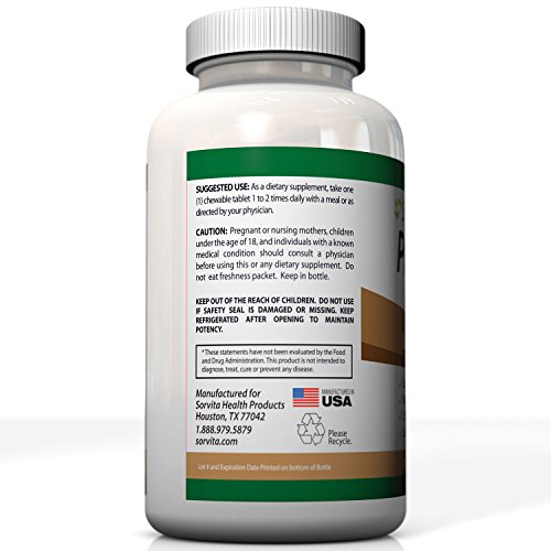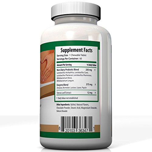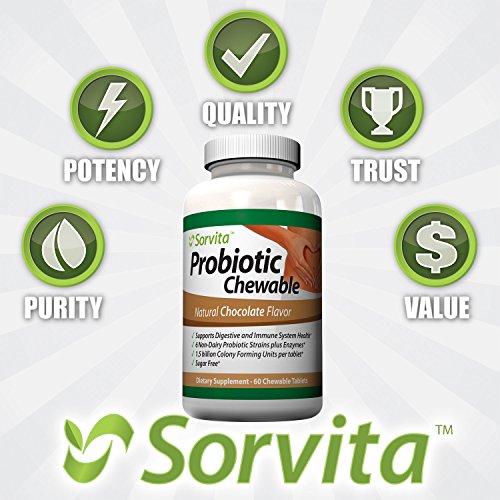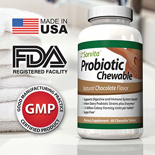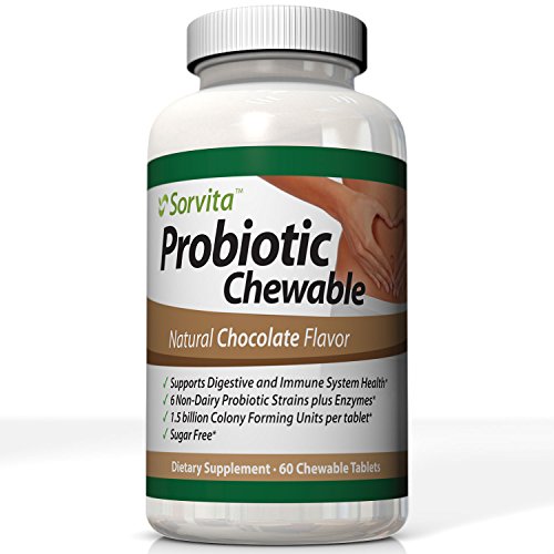 - Feature : 6 NON-DAIRY PROBIOTIC STRAINS PLUS ENZYMES* - 1.5 billion Colony Forming Units per Tablet* plus 5 digestive enzymes in every pill. Perfect if you've had issues with dairy, gluten or sugar from other probiotic products. / SUPPORTS DIGESTIVE AND IMMUNE SYSTEM HEALTH* - Help restore the Good Bacteria killed by antibiotics and combat illness and indigestion. If you suffer from vaginal or bacterial infections, acne, food intolerance, bloating, diarrhea, gas or chronic digestive issues and want relief now, you should give our chewable probiotic a try. Designed to support nutrient absorption and digestive tract function, this daily supplement contains non-dairy probiotics complete with a broad-spectrum of enzymes that work together to support your digestion and GI tract health. / SUGAR FREE* - Sweetened with Stevia Leaf Extract, each Chocolate Tablet is about the size of 3 stacked nickels. Don't choke down bad tasting capsules or pills anymore. Our chews TASTE GREAT but do NOT look like candy so kids won't mistake these supplements for a snack. / HIGH QUALITY PREMIUM SUPPLEMENT MANUFACTURED IN USA in FDA Inspected Good Manufacturing Practices (GMP) Certified facilities and delivered right to you. This is a Great Value with 60 chewable tablets in every bottle. / MONEY BACK GUARANTEE - Order Now with Confidence. SorvitaTM Probiotics Include a 100% Satisfaction Guarantee. No catches. Get Results or Get Your Money Back. Order 2 Bottles Today to Get FREE Super Saver Shipping!