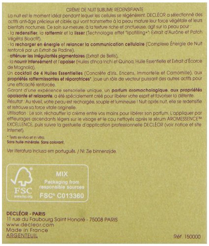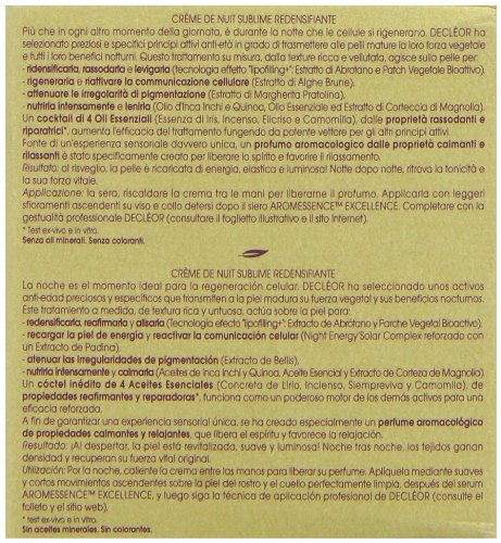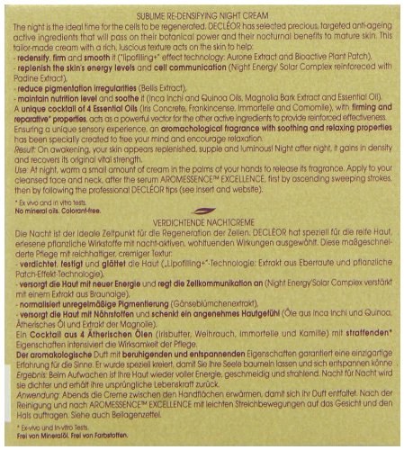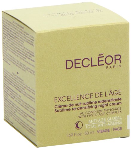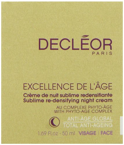 -. Binding : Health and Beauty -. Brand : Decleor -. Color : no color -. Department : Beauty -. EAN : 3395011500005 -. Feature : Excellence de l'age sublime re-densifying night cream was launched by the design house of decleor / It is recommended for daily use; Please store in a cool dry place / Excellence de l'age sublime re-densifying night cream by decleor for unisex, 169 ounce cream -. IsAdultProduct : 0 -. Label : Decleor -. Manufacturer : Decleor -. Model : DECCOSC73500005 -. MPN : DECCOSC73500005 -. NumberOfItems : 1 -. PackageQuantity : 1 -. PartNumber : DECCOSC73500005 -. ProductGroup : Beauty -. ProductTypeName : BEAUTY -. PublicationDate : 2013-08-09 -. Publisher : Decleor -. ReleaseDate : 2015-05-15 -. Size : 1.7 oz -. Studio : Decleor -. Title : Decleor Excellence De L'age Sublime Re-Densifying Night Cream for Unisex, 1.69 Ounce -. UPC : 885344327750