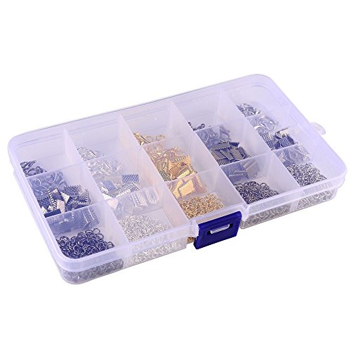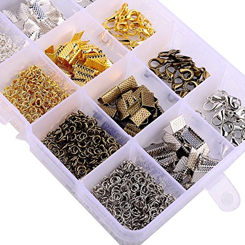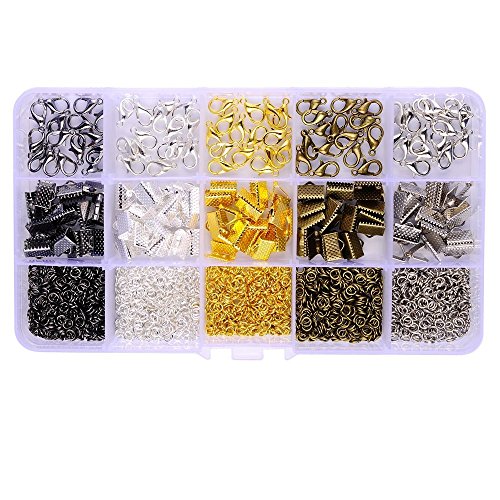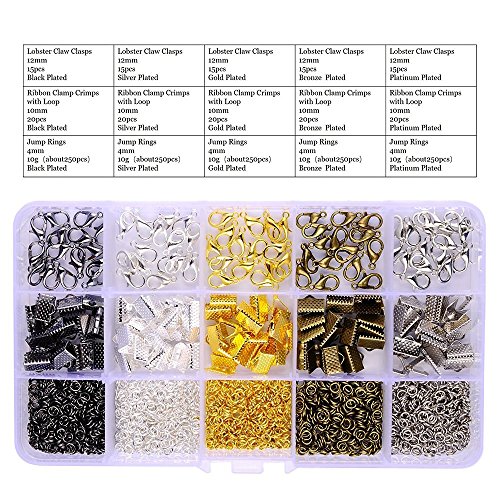 In A Box(1325pcs/box) Kit with 5 Colors 1150 Pcs Open Jump Rings 4mm and 100 Pcs Ribbon Clamp Crimps with Loop Iron Ribbon Ends 10mm and 75 Pcs Lobster Claw Clasp 12mm Jewelry Making Findings