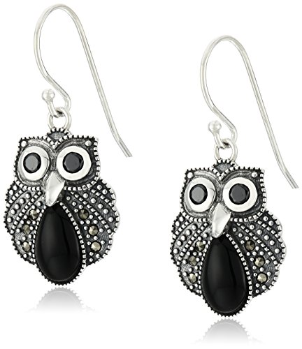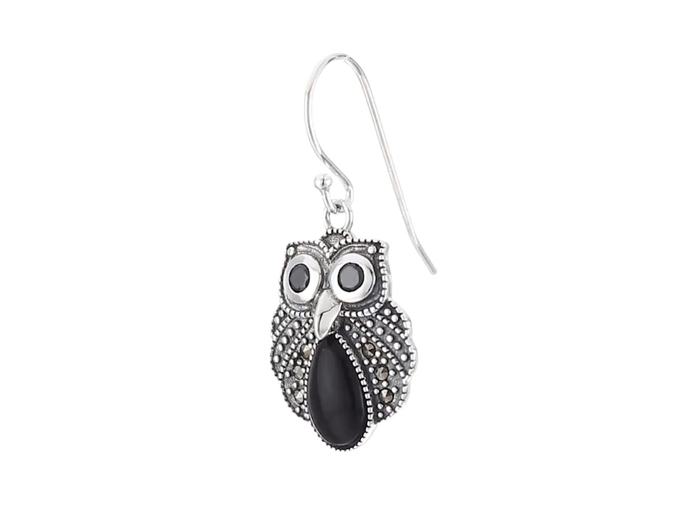 Sterling Silver Onyx and Marcasite Owl Drop Earrings