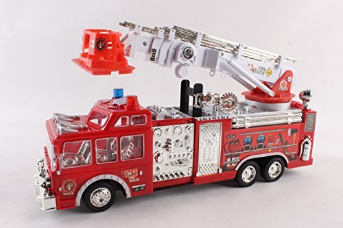 -. Feature : Both boys and girls will enjoy using the Litzpy Large 16" Realistic Fire Truck Fire Engine to play out rescue and firefighting scenarios. / Lights and Sirens - Colorful LED lights flash, and the sirens play while the truck is running, Getting nerves of the siren sounds? Don't worry you can turn the sounds off while letting the toy running!! / Truck Body - Contains realistic controls and hookups on both the sides and the back, plus decals of fire hydrants, face masks and other vital tools that firefighters use. / Tower Ladder - Extends up to 16" and features a basket where a child can place a firefighter action figure. The ladder moves up and down and swivels 360 degrees. / Eco-friendly Plastic - This truck is made of hard eco-friendly plastic that adds durability as well as protect the environment. Size - 16 x 4 x 7 inches Requires three AA batteries, (Not included)