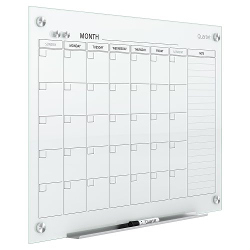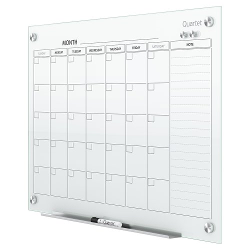 - Feature : Tempered glass, magnetic calendar board will not stain or ghost. 15 year warranty. / 1-month calendar design is reusable month after month / Write on the white color glass calendar with dry-erase marker or post papers using magnets / 3' x 2' frameless board blends seamlessly into any environment / Non-absorbent glass is easy to keep clean with Quartet whiteboard cleaning supplies