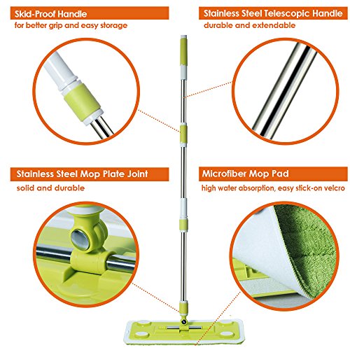 Firm Structure and Durable Quality - Sturdy stainless steel handle with extended length. Durable and machine washable microfiber mop pads for both wet and dry use.