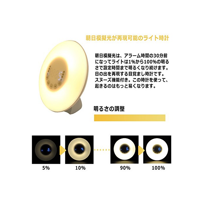 1.【아사히 모의광이 재현 가능 라이트 시계】아사히 모의광은,알람 시간의 30 분전이 되어 라이트는 1%부터 100%의 밝기로 설정 시간까지 밝아지는 것을 계속합니다.일출을 재현하는 자명종입니다.《스누즈》기능 첨부 와.이 때계를 사용하고, 일어나는 것은 더 쉽게 됩니다.