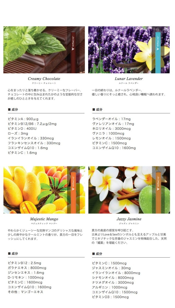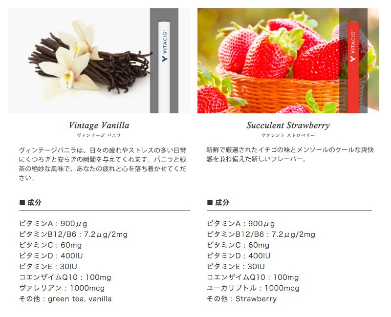 | 商品説明 | これからはビタミンを吸う時代♪ ビタシグは、天然成分とビタミンだけを含むピュアでクリアな蒸気を吸うことができます。 ニコチンやタールは含んでいません。 高級なデザインで不快な臭いはなくビタミンとフレーバーを楽しむことができます。 |
