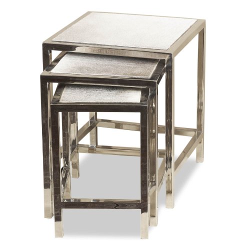 -. Brand : Kathy Kuo Home -. Color : Brown -. Feature : Largest table is 22 inches high x 18 inches wide x 18 inches deep; medium table is 20 inches high x 15 inches wide x 15 inches deep; smallest table is 18 inches high x 12 inches wide x 12 inches deep / Constructed from steel and cowhide / Polished finish on steel base. / Hide will vary from a cream to medium gray - some subtle spots may appear on hide. Hide color cannot be specified / Three nesting tables can be easily stored under one another -. Label : Kathy Kuo Home -. Manufacturer : Kathy Kuo Home -. MPN : 129027 -. PartNumber : 129027 -. ProductGroup : Furniture -. ProductTypeName : HOME_FURNITURE_AND_DECOR -. Publisher : Kathy Kuo Home -. Studio : Kathy Kuo Home -. Title : Moro Modern Steel and Cowhide Nesting Tables - Set of Three