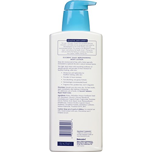 -. Feature : Formerly known as "Eucerin Daily Replenishing Body Lotion." You may receive either product depending on availability. / Dermatologist recommended brand / Deeply moisturizes and replenishes for healthier-looking skin / Fast-absorbing, non-greasy formula moisturizes for 24-hou / Fragrance-free, won't clog pores