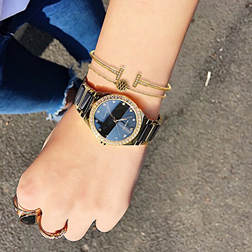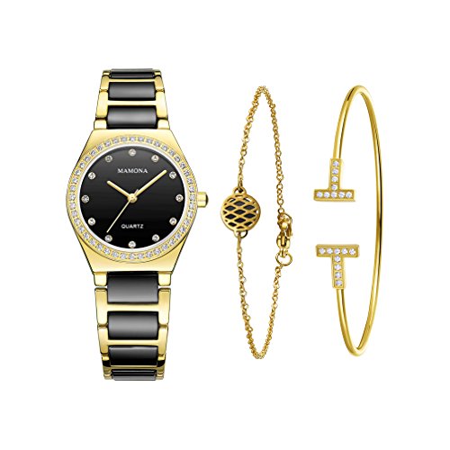 Ladies Quartz Watch Women bracelet set-MAMONA Gold Black Ceramic and Stainless Steel Watch Set 3875LBKT