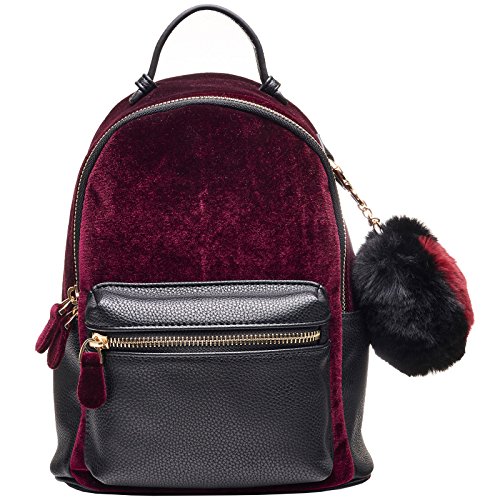 -. Title : Dream Control Velvet & Vegan Leather Pom Pom Mid Backpack Shoulder Handbag