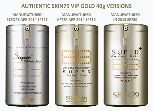 4 authentic versions of Skin79 VIP Gold currently exist in the market (please see the above pictures). (1) VIP Gold with Spf25 which was manufactured before or in April 2014. (2) VIP Gold with Spf30 which was manufacture after 2nd of April, 2014. (3) VIP Gold Spf30 with new bottle, package & logo designs. (4) "Wrinkle Improvement" printing has been changed to "Anti-Wrinkle" in September 2015. These versions are all authentic. Please contact your seller and ask which version your would receive before place an order or check out each seller's condition note