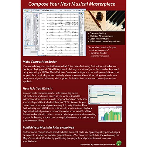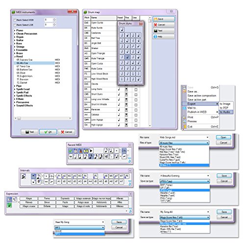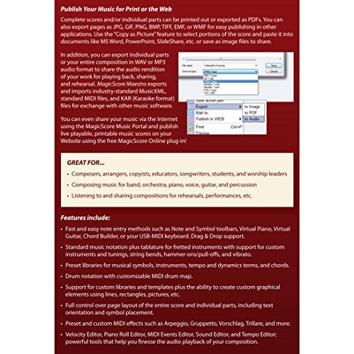 Print, preview, or export scores as PDF, BMP, JPEG, and GIF to publish your music via print or the web. Import/export MIDI and Music XML files for exchanging with other music applications