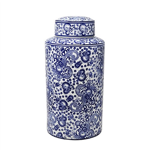 Benzara BM165328 Blue/White Floral Patterned Ceramic Covered Jar