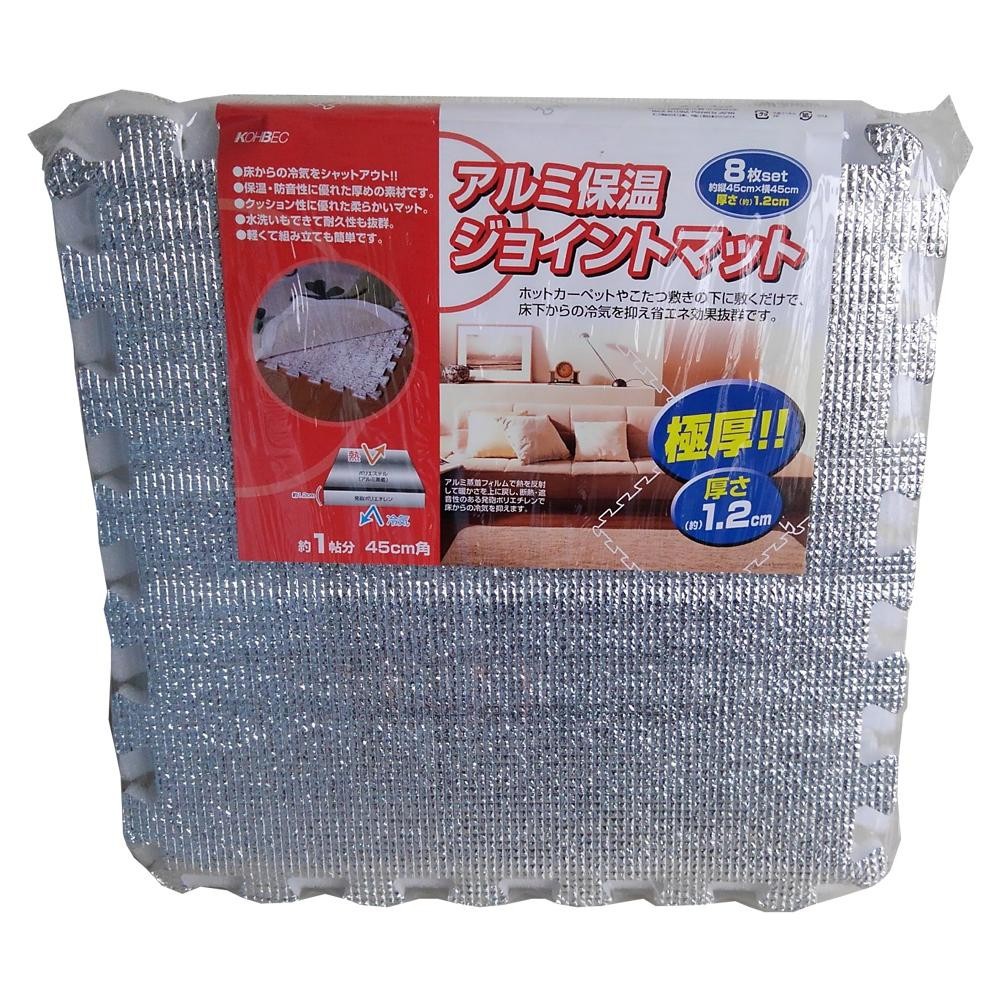 fk094igrjsホットカーペットやこたつ敷きの下に敷くだけで、床下からの冷気を抑えます厚さ1.2cmで、クッション性に優れています サイズ 1枚あたり:約45×45×1.2cm 個装サイズ:45×45×10cm 重量 個装重量:390g 素材・材質 表面:PETアルミ蒸着フィルム 裏面:発泡ポリエチレン セット内容 8枚入 生産国 中国 組み合わせて使えるジョイントマット ホットカーペットやこたつ敷きの下に敷くだけで、床下からの冷気を抑えます厚さ1.2cmで、クッション性に優れています