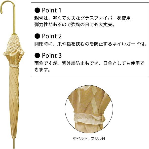 fk094igrjs裾やベルトにフリルを施した、お嬢様風デザインゴールドの持ち手もポイントです サイズ (約)親骨:58cm、傘の直径:90cm 個装サイズ:7.0×71.0×7.0cm 重量 約265g 個装重量:350g 素材・材質 親骨:グラスファイバー(8本使用) 生地:ポリエステル 仕様 開閉:手開き 深張り 生産国 中国 ストライプ×フリルデザインの、深張りタイプの長傘 裾やベルトにフリルを施した、お嬢様風デザインゴールドの持ち手もポイントです