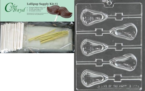 Cybrtrayd Large Lacrosse Lolly Chocolate Candy Mold with Lollipop Supply Bundle, Includes 25 Lollipop Sticks, 25 Cello Bags and 25 Gold Twist Ties