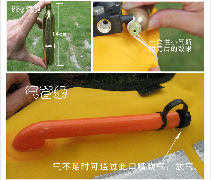 (Inflatable life-saving belt) Bubble: Unfortunate water or water in distress, the automatic belt inflatable life bucket device with water-soluble detonator with water will automatically open the valve on the life cycle inflatable; manual belt-type life buoy must be opened by hand Inflatable valve, gas cylinders high pressure gas rapid expansion of the ring airbag stretched cloth into a life buoy, placed under the two axils