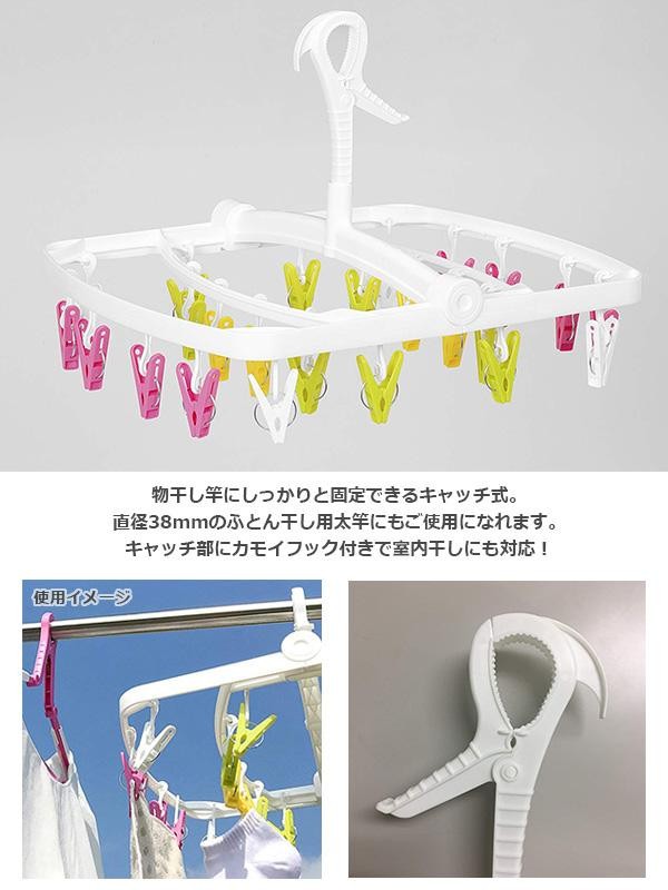 開閉がスムーズな上開き式。また、チェーンやワイヤーが無いので、ピンチの絡み対策に。洗濯物に跡が残りにくい細かな凸面構造のピンチを使用しており、傷んだらお手持ちのピンチと簡単に交換できます。 |