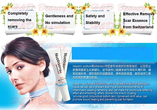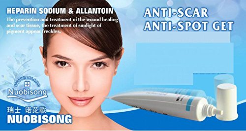 -. Feature : Scar removal to gel ointment introduced Switzerland beauty skin experts new formulation. particularly natural aloe plant extract on the skin can prevent the sun cause redness and burning. also have an anti-inflammatory effect can promote cell metabolism and regeneration of the injured skin muscle and tissue restoration. / Heparin sodium and Allantoin can induce the formation of good skin tissue, as well as prevent scarring around the occurrence of inflammatory swelling (hardening) and also provide wound scars a softening and smoothing effect. / It also helps to shorten the time to crusting, provide good conjunctival bottom skin, convenient shift value and can promote wound healing and preventing scar formation. / Nuobisong is suitable for scars cause by: Surgery, Burn, Cuts, Acne, Tattoo Laser and other fortuitous scars. / Usage and Direction: Clean affected part before apply, take approP.R.Iate amount and gently apply on affected area and massage till fully absorbed (Apply 2-3 times a day).