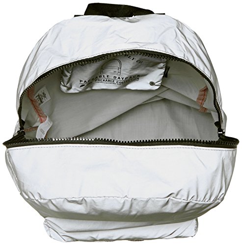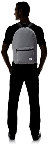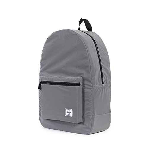The lightweight packable daypack is constructed with reflective nylon and fits into its own internal pocket for easy storage.