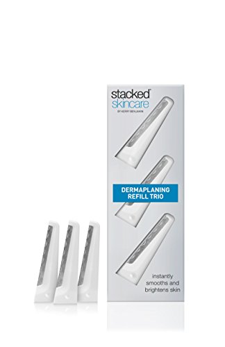 Safely remove peach fuzz and dead skin cells with this non-invasive exfoliation tool for instantly smoother and brighter skin. Designed to provide similar results to an in-office dermaplaning treatment, this at-home tool gently purifies skin of dead cell build-up and fine facial hair to reveal a bright, youthful-looking complexion. By removing the surface layer of dead cells, dermaplaning allows products to fully soak into the skin-boosting the efficacy of the serums and creams you already own. With regular use, skin is left smooth, soft, and luminous. Our dermaplaning blades are more of a exfoliator machine than a simple dermaplaning razor. One of the differences between our facial exfoliating brush and the other solutions out there is our blade guard is still going to give you some protection but we allowed for much more blade and a lot less blade guard where the other tools on the market are primarily just a blade guard. As a result you do not get as deep a treatment as our exfoliation tool. This isn't an exfoliating sponge or an exfoliator brush or cloth, but it does work better than these products. It's going to instantly brighten, plump up and hydrate your skin. Mix with other StackedSkincare products for a complete skincare solution from the comfort of your own home. Note: Blades should be replaced monthly and you can purchase our Refill Pack with a 3 month supply on Amazon or our site with auto refill.Feature
